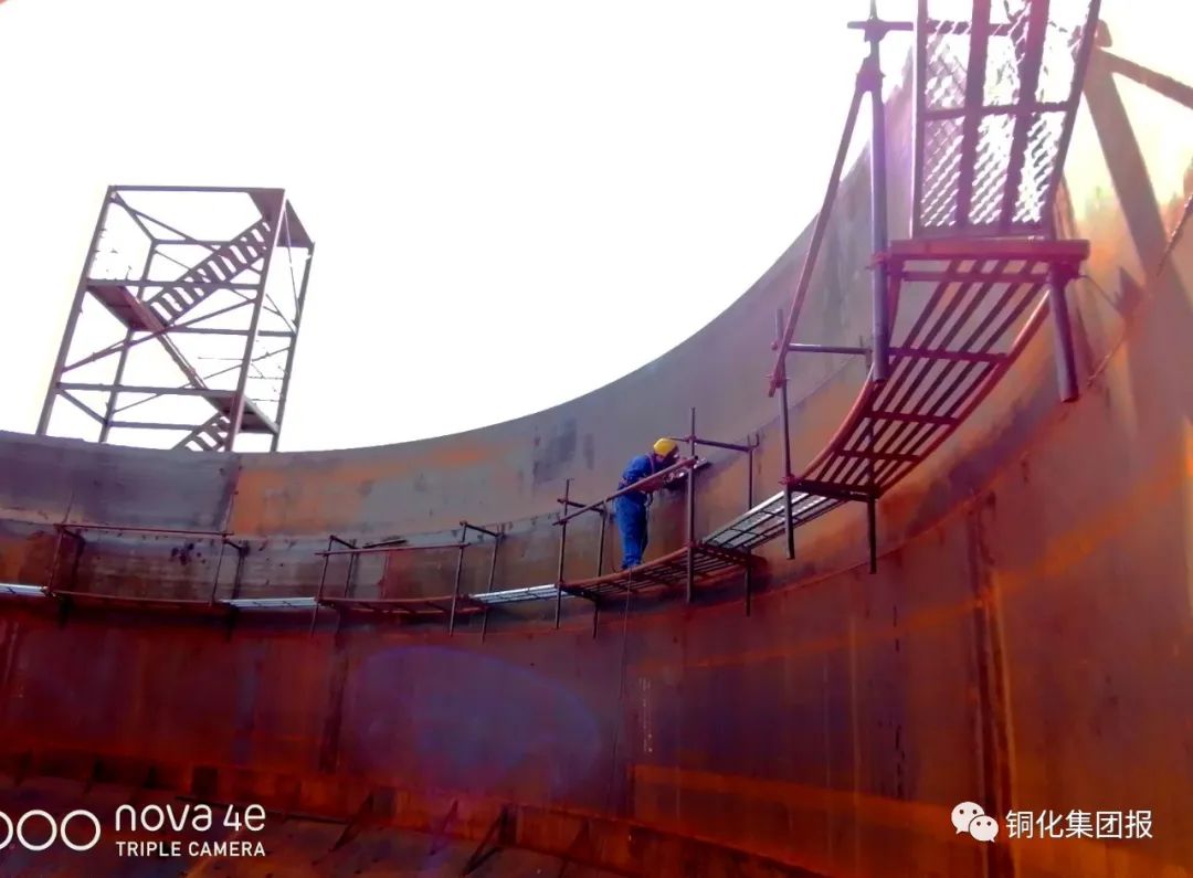 為促進(jìn)礦山綠色發(fā)展,新橋礦業(yè)公司投資近2200萬元,對全尾砂充填系統(tǒng)進(jìn)行技改。該工程于2月動工,預(yù)計7月底收官運(yùn)行。屆時,選礦廠、選鐵廠生產(chǎn)尾砂及污水處理站淤泥經(jīng)混合處理可全部用于井下充填,實現(xiàn)礦山生產(chǎn)固廢零排放。圖為5月21日,工人正在施工現(xiàn)場焊接直徑18米的深錐濃密池?!√丶s記者/ / 朱常林/ / 攝